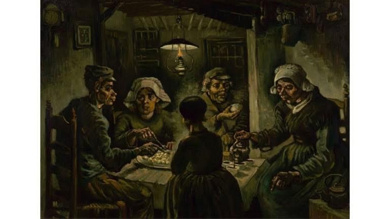 Ван Гог показва бедно семейство, което яде това, което само е произвело – картофи. Проста, първична храна.
